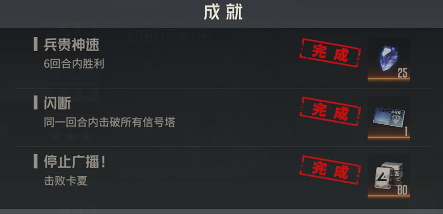 停止广播:要求击败卡夏,卡夏位于地图中部,我方中间两个位置距离其较近。在中间位置部署战力较强的机师,会比较容易击败卡夏,需要注意的是,破坏两个信号塔后,游戏就会结算,想要达成此成就,需要注意不要太快破坏信号塔