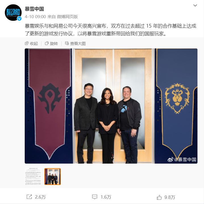 在推文中,暴雪中国还发布了一张丁磊(网易CE兼董事)Johanna Faries(暴雪娱乐总裁) ,Phil Spencer(微软游戏CEO)三人的合影。