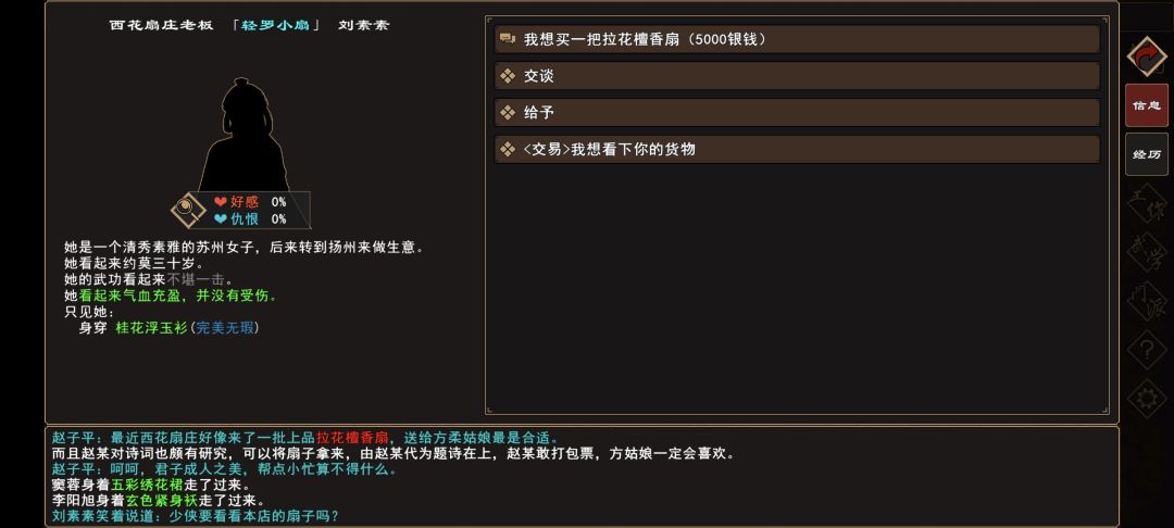 (2)前往 扬州城→西花扇庄 购买[拉花檀香扇],需要5000银钱。