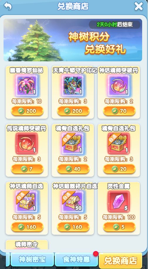 活动简介:活动期间,将开启食神考验、神树密宝、食神特惠、兑换商店等4项内容