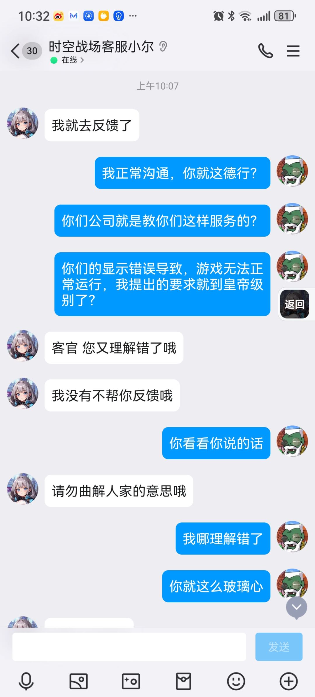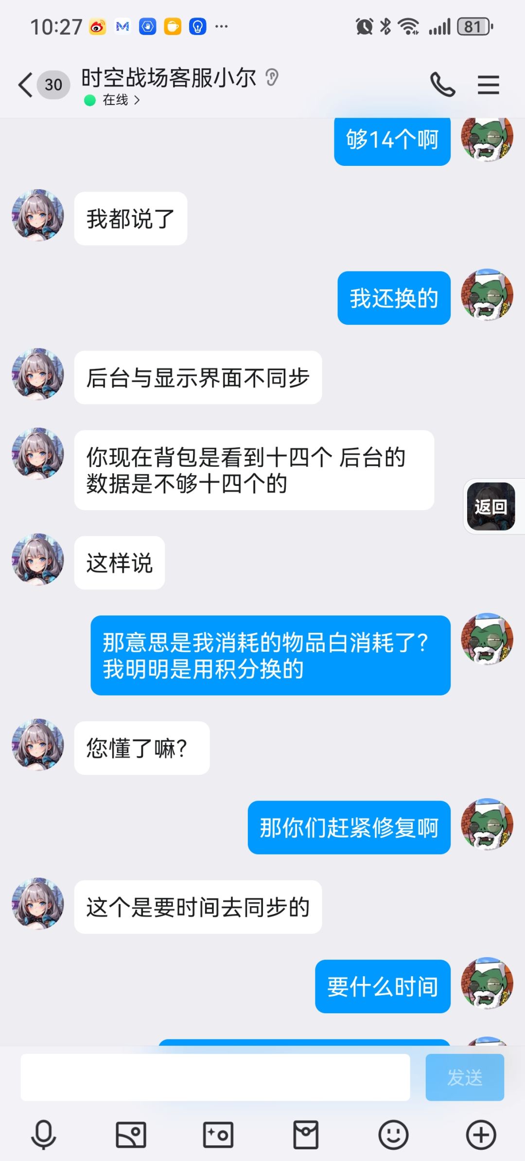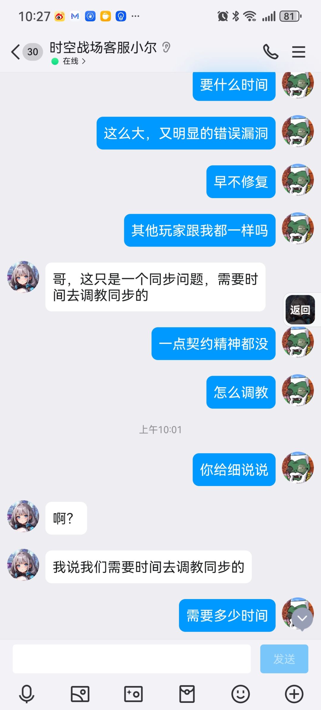 起因是神眷者升级20级的时候,界面显示需要28万游戏币和14基因优化液,我都准备齐了,然后点击升级,显示所需消耗不足,然后我就问客服,这个小尔。以上就是9张聊天截图,还有三张张放不下了,大概意思就是我提出的是无理要求,皇帝般的,并且要求我要端正态度