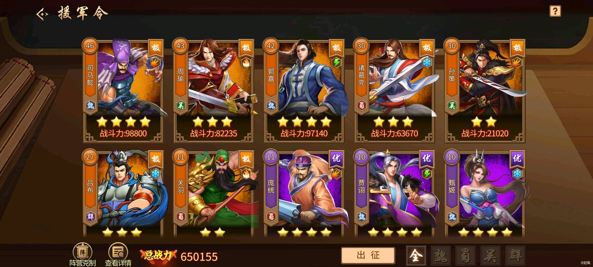 基本和基础属性1点加3点战力相差不大,不特别较真的话,基本可以按照援军战力*3就是实际战力。援军令如果橙色全部三星的话,基本总战力在80w以上,实际加的战力最少250w+😌