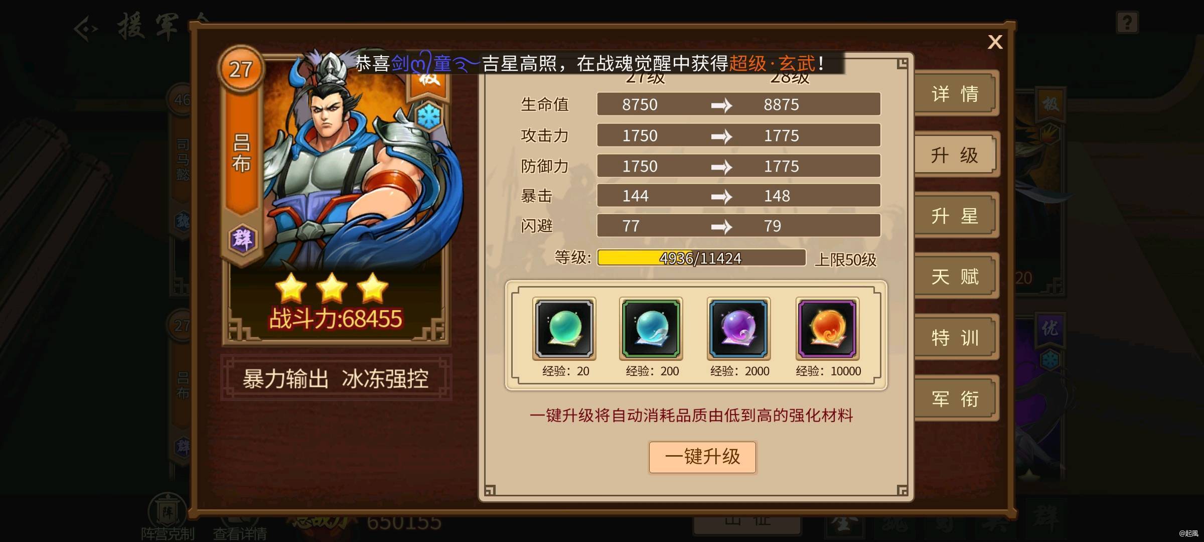 以升级为例,橙色援军吕布25-26,生命值+125,攻击防御+25,暴击4,闪避2。援军战力加了105,实际战力加了379,约等于3.6倍。
