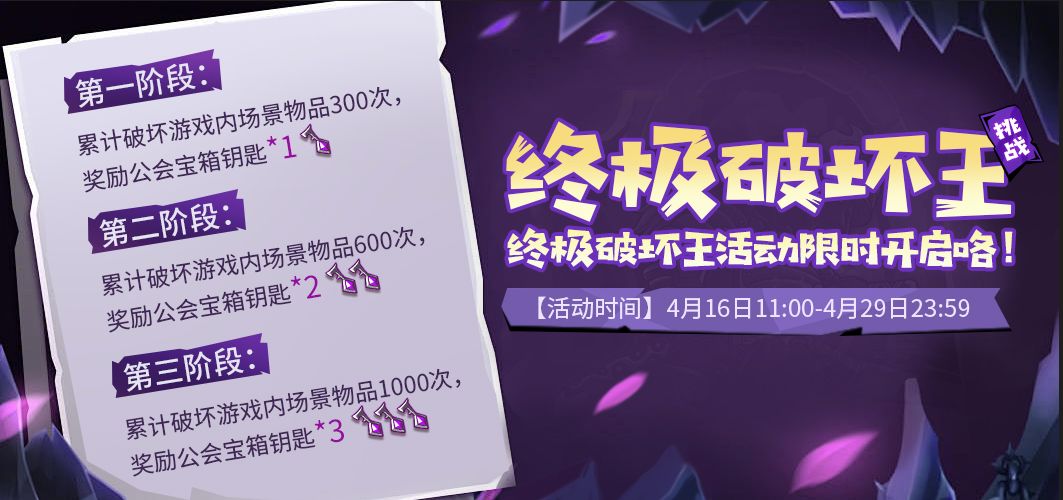 第二阶段:累计破坏游戏内场景物品600次,奖励:公会宝箱钥匙*2
