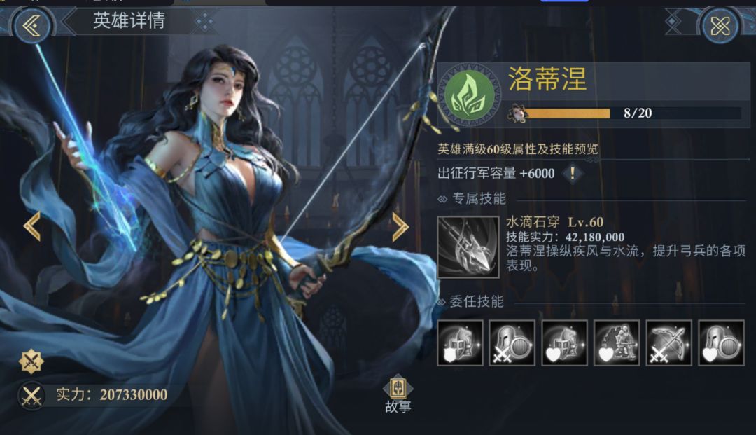 洛蒂涅是自由风格英雄,也是武器大师职位,其技能可分别提升弓兵部队攻击、防御数值,定位与洛特王类似。这两个英雄都可委任在武器大师的职位上,大家有抽到哪个就养哪个。