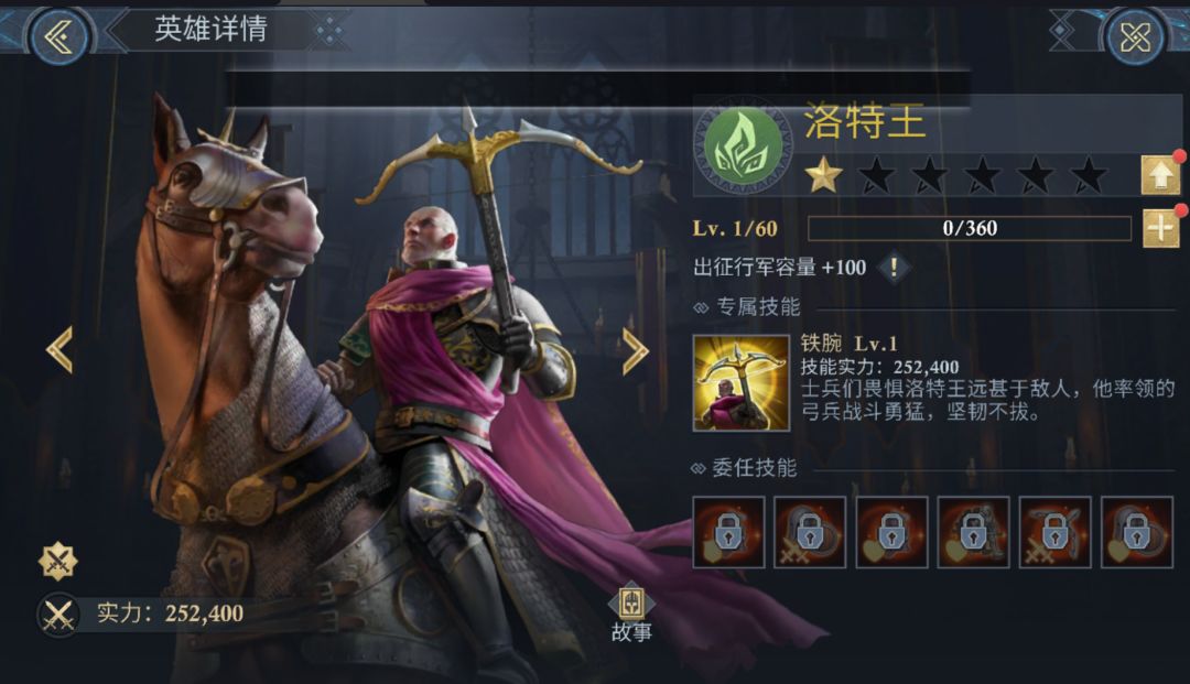洛特王专属技铁腕可提升弓兵部队攻击、生命数值,并且在激活自由共鸣时可降低敌方骑兵攻击,从而减少敌方骑兵队对己方队伍的冲击。其委任技能可全面提升骑兵、步兵、弓兵的相关属性数值,比较适合均衡队伍构筑。