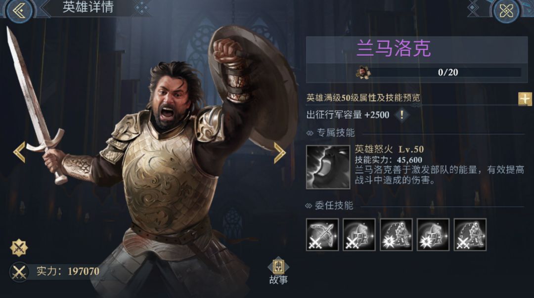 兰马洛克属于各部队通用型英雄,每10回合可基于当前部队数量对敌方造成一次额外伤害,用于提升队伍的输出。萌新们可先养一下这个英雄,后续有更好的选择再进行替换。