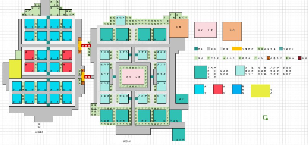 上面为宗门主布局,主打四方围城的设计理念,九宫格宗门事物建筑将宗门大殿紧紧围绕,4个洞府隐藏在宗门之后,主打一个隐蔽。布局中的百合花圃,可以适当替换为其他颜色的花圃或者其他绿化建筑。