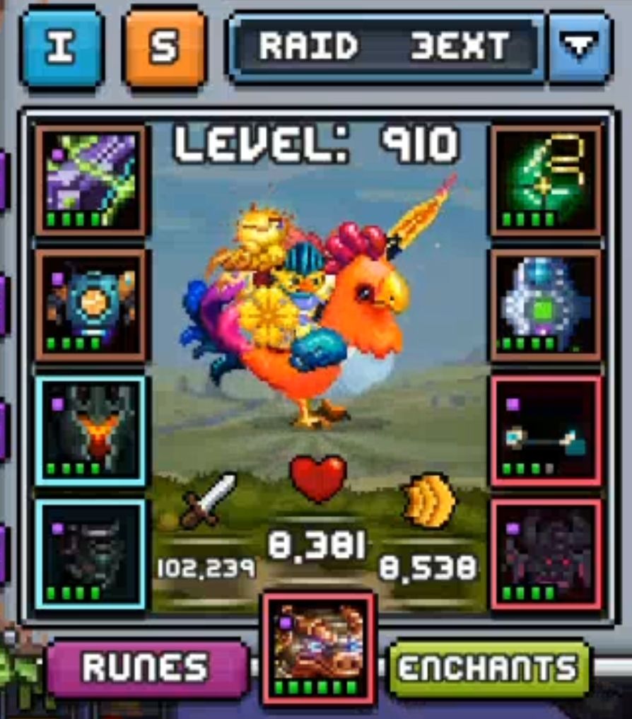 t21raid套装+raid神话副手+t21远古头(概率增加自己回合版)+双击/accu的acc+打人彩虹鸡/打人独眼恶魔+sp回复的6角符文+高速坐骑(我不换高速金坐骑因为胜利后分数和总属性挂钩)