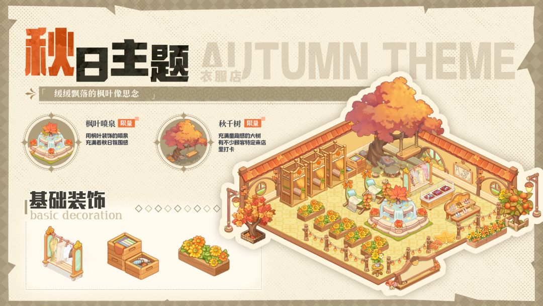 秋天,是那一抹金黄与深红交织的季节,是枫叶轻舞、思念飘落的时光。而今,我们将这份秋天的浪漫与温馨,巧妙地融入到了《开间服装店》的家具装修中,打造出了独一无二的秋日主题风格。