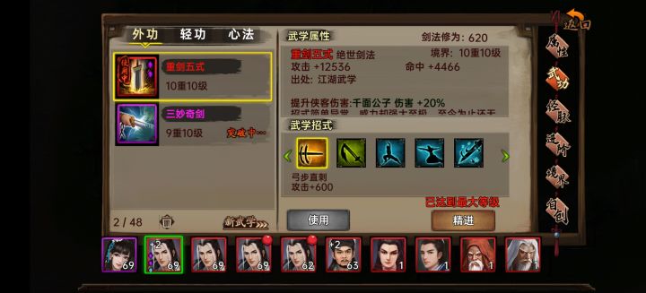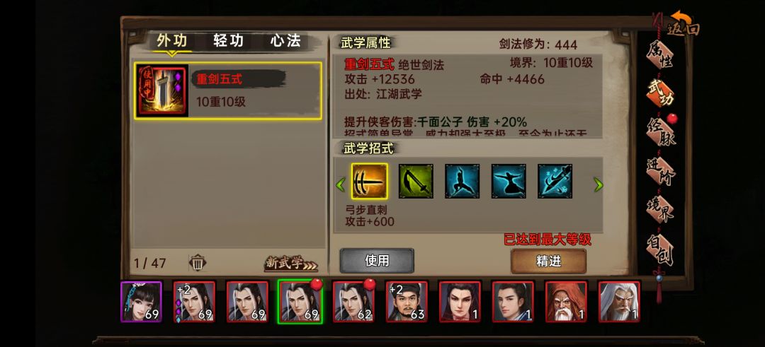 之前在论坛看到有伙伴说剑系命中高,所以创了这个五剑阵容(四千面,主角学剑),历时约7个月,大致创建了约300账号,微氪400多元,主要用于招募,目前五剑阵容69级均无红内,外功10级没有资源来精进,无量38层,蛮王8层。目前玩法是有时间就做门派任务,塞外买剑法,打打蛮王和无量洞(黑龙洞不掉武功不打),没时间就偶尔挂无量。现最大的问题是缺少剑法以及红轻红内功,不知道各位大佬有没有合适获取剑法红内青功的方法分享?