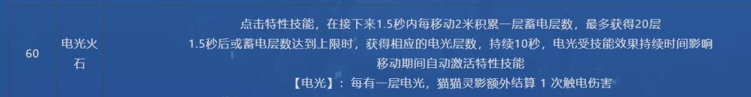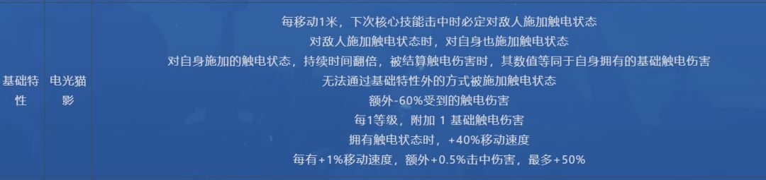 每移动1米下次核心技能就会对敌人和自己造成触电,可以理解为全程自身都有触电状态。