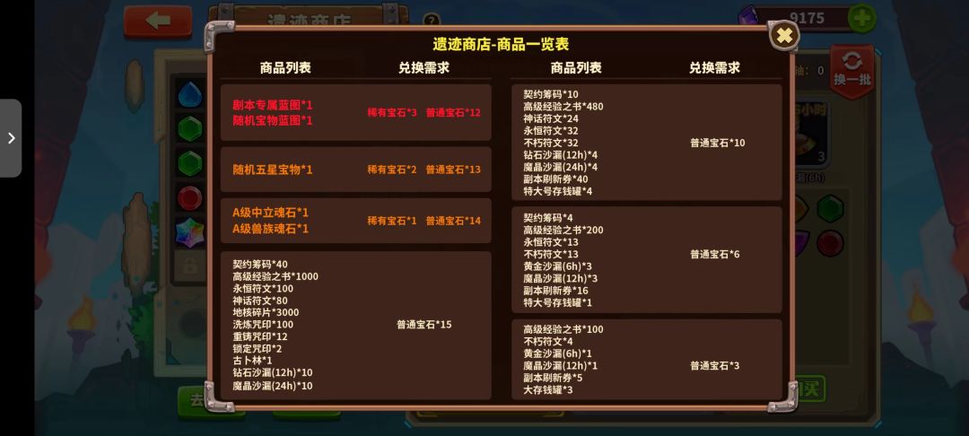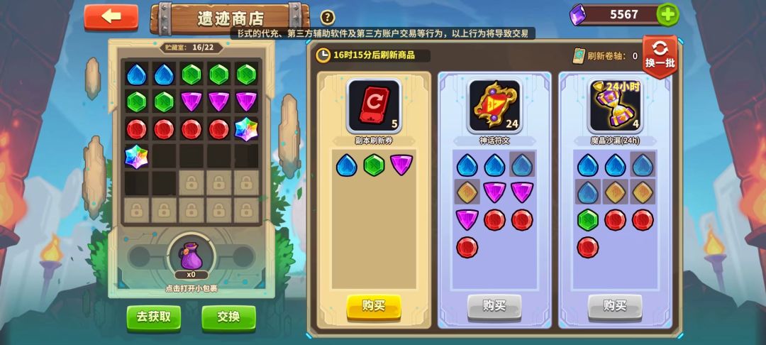 然后介绍一下机制,商店他的机制是随机出三种物品,可以用刷新卷刷新(刷新卷游戏中有部分功能获取)。每种物品都需要不同数量指定颜色的的宝石换(宝石通过宝石袋开出来,概率是各种颜色的普通是97.5%,三种特殊的2.5%)。宝石袋是空岛各种活动获取(或者直接买)。如下图,就是某运气不好的商店截图。宝石可以三个换一个指定颜色。具体位置等我明天进了游戏截图。