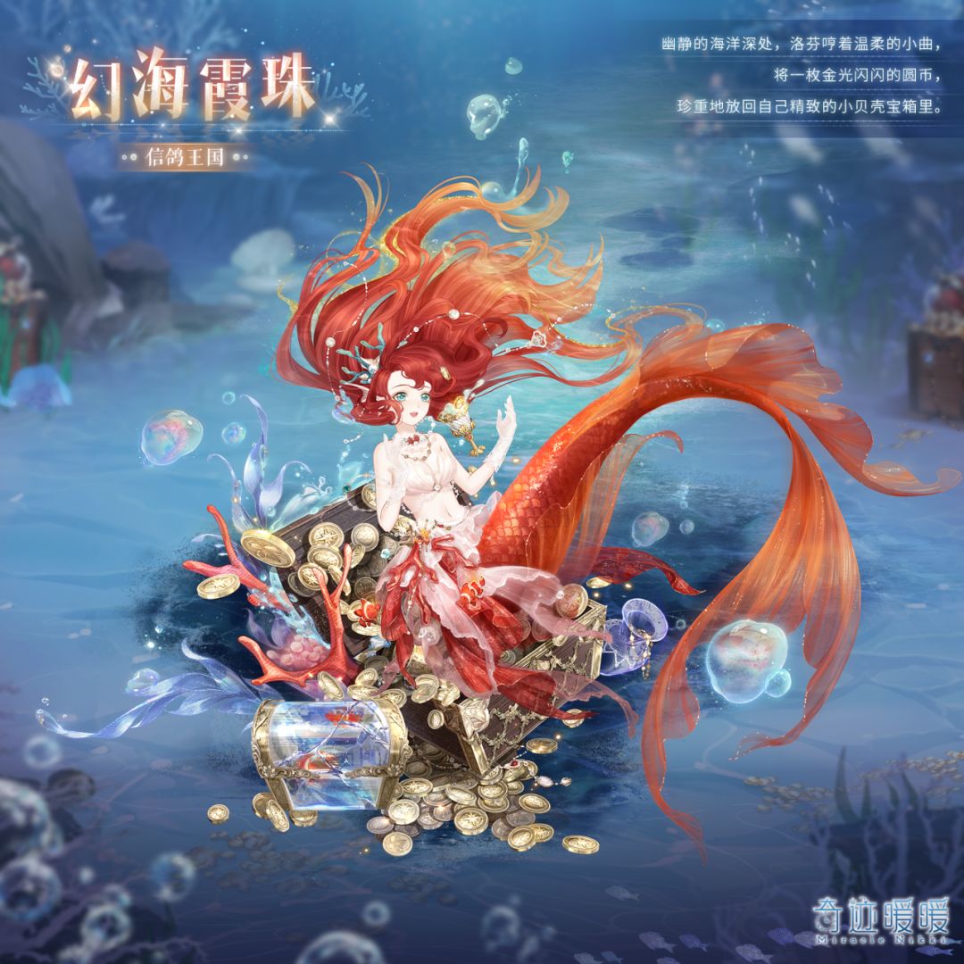 【幻海霞珠】含正常姿势与特殊姿势,全新妆容“月华流心”,赤色鱼尾“时空相闻”,精美可移动摆件“笑语连珠”、“浪蕊轻舞”、“心弦共鸣”、“天籁泠音”,精美面饰“风雨如晦”,鳍型耳朵“星海相随”。