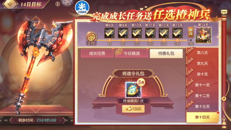 神兵兑换太凰射日弓。记得买今天的特惠礼包。