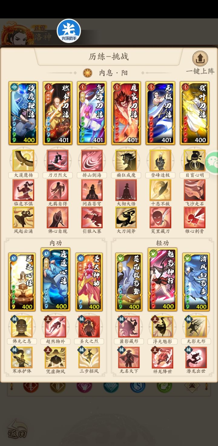 我看现在前期的阳刀师弟师妹们,都带着金钟罩和石破,这个也算稳定,我今天给大家推荐一个拉条的套路。我是从前期玩到现在的中期,还是有体会的。我们的主要对手是拳和剑,这2个对手天生拉条极快,其实我们也有办法把条拉起来,这样可以多砍2刀。办法就是主逍遥,副清风搭配潜龙,这样拉条基本不输拳和剑,虽然属性亏一点,到可以多砍2刀啊,这样和对手也有一战之力。我就是这样搭配一直到洗出千里鞋才换的金钟罩和石破。师弟师妹们试试吧。大家看自己情况,想稳定点就金钟罩和石破,想拉条多砍2刀就逍遥清风,武学里的招式,前期有的缺,我没换招式,大家现在用啥还用啥就行了。这里我主要想说的是内轻搭配。