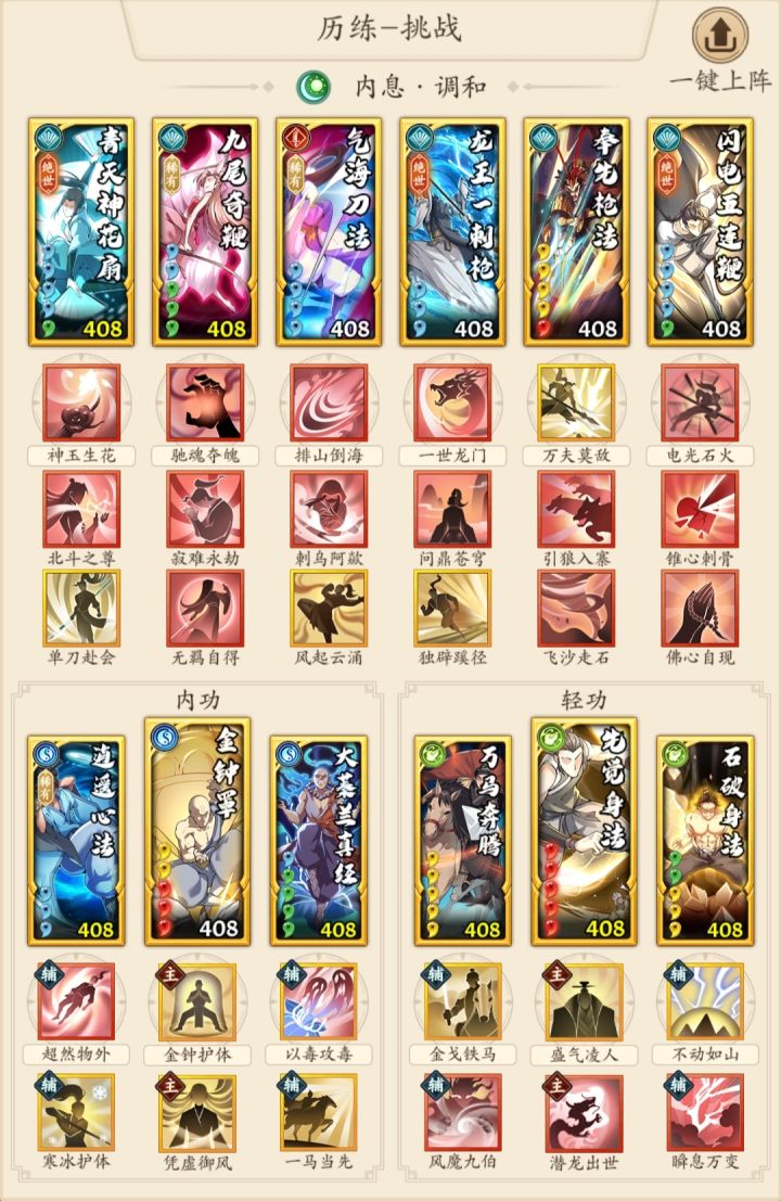 内、轻功针对性极强,要认真理解招式说明,几张重点卡至少要养绿,自带招式(都)3星往上。