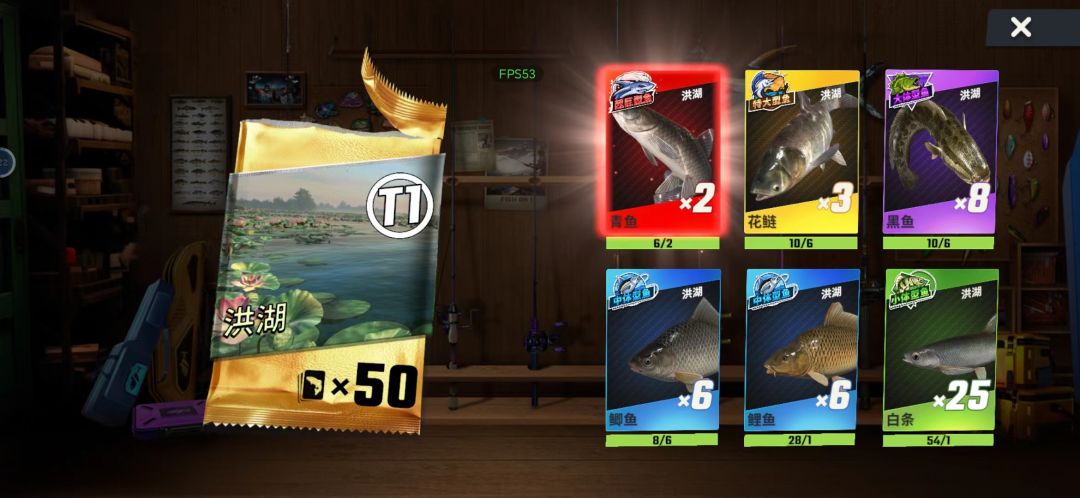 ✅鱼竿分T1-T4级别,每个级别都有蓝色至金色的鱼竿。