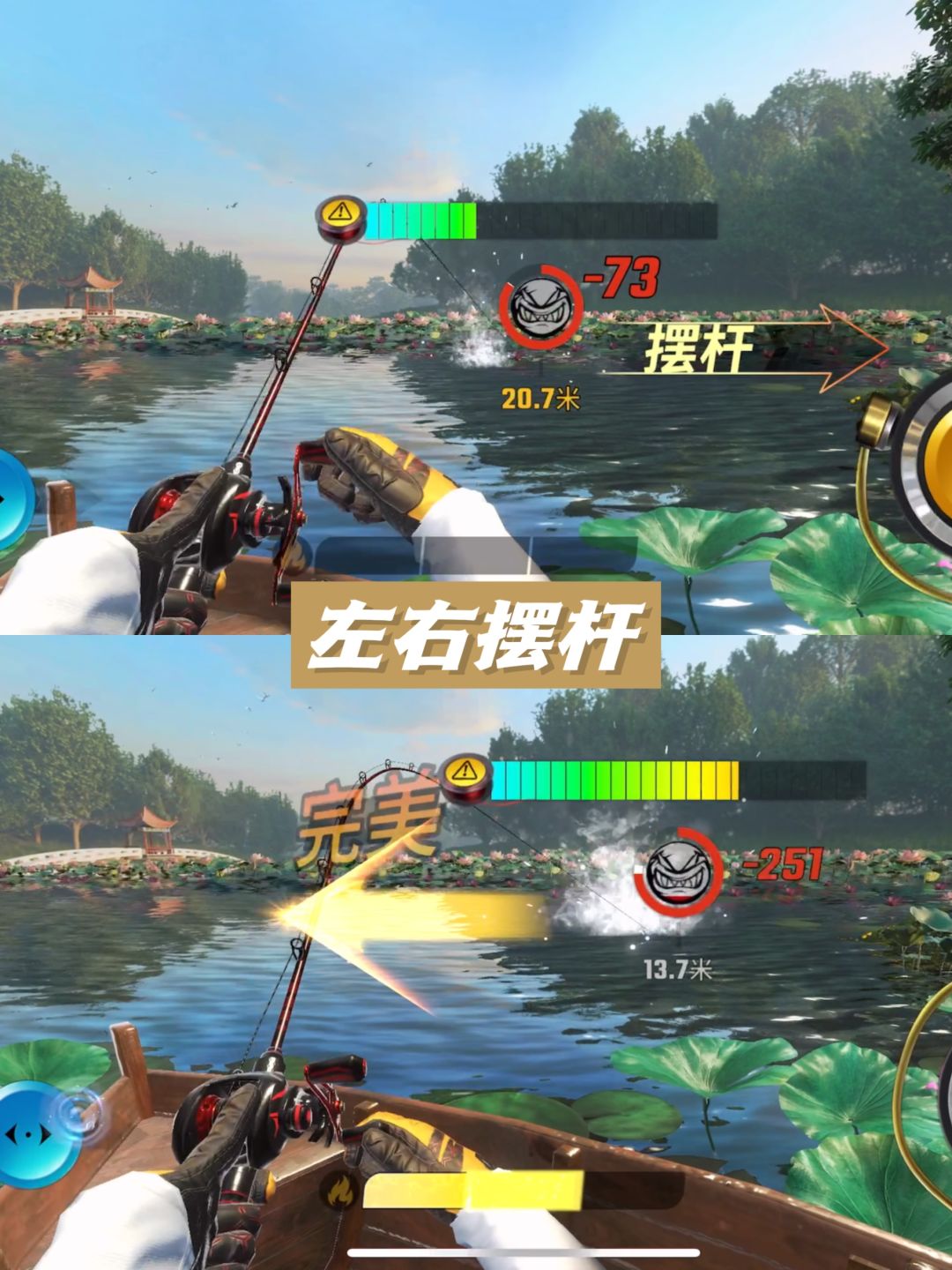 游戏画面可随手机的方向角度变化而同步调整!收杆时还有震动反馈!不想再下一杆子都难!