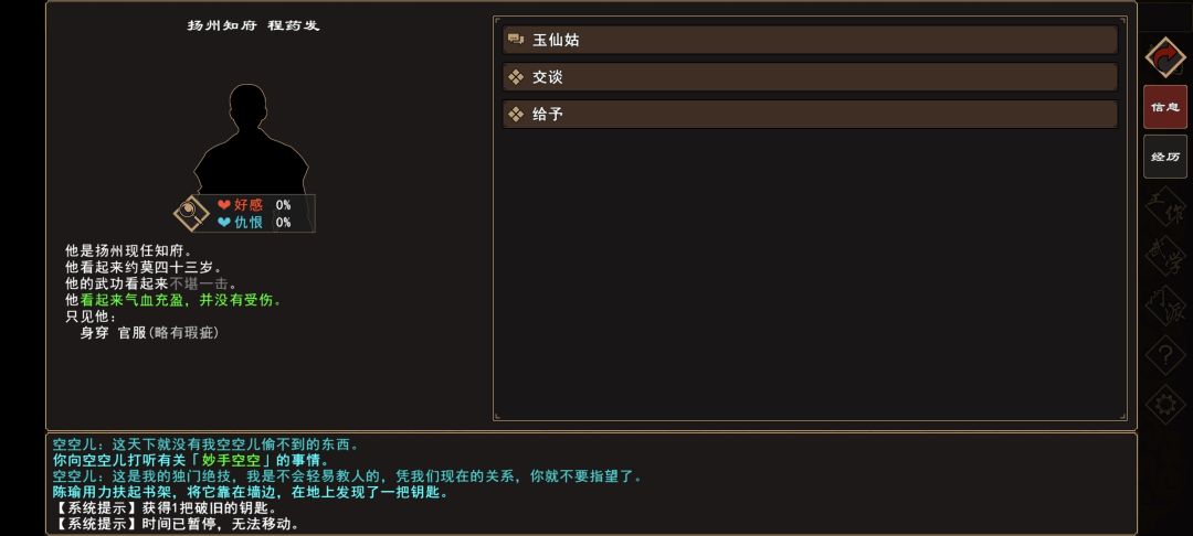 (3)没有劝服[程玉环],前往 扬州城→衙门大厅→[人物:扬州知府 程药发]对话 选择:“玉仙姑”,完成任务。
