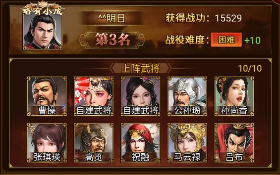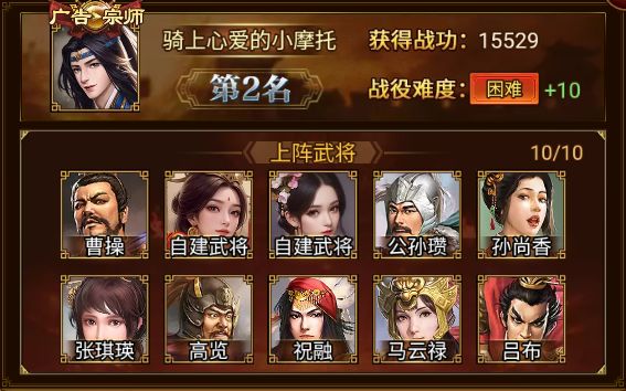 曹操、公孙瓒、孙尚香、高览、张琪瑛、祝融、马云禄、吕布、自建武将*2