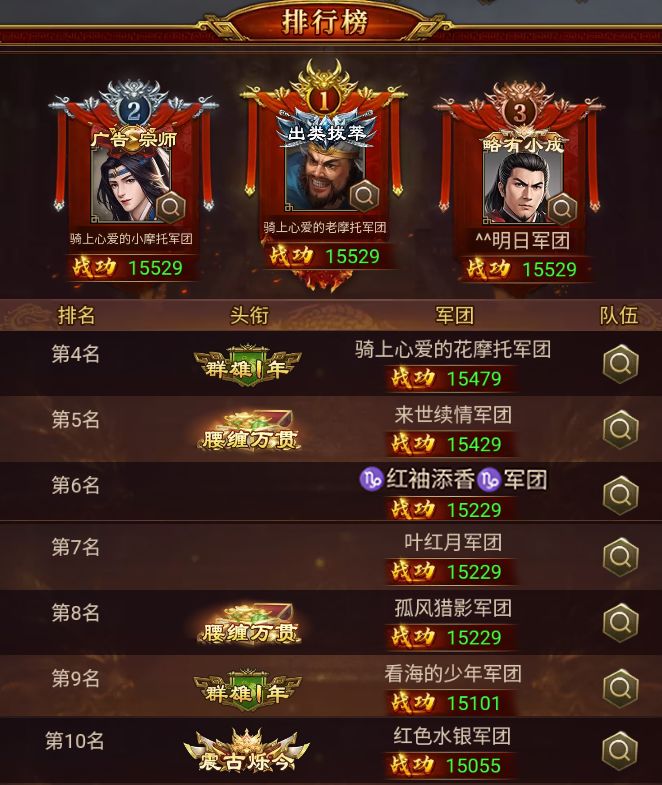 成功荣登本期下邳之战榜首的是 骑上心爱的老摩托 军团,以 15529 的优异战功拿下,恭喜!
