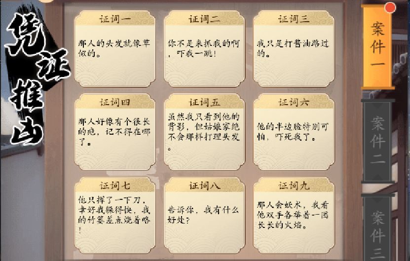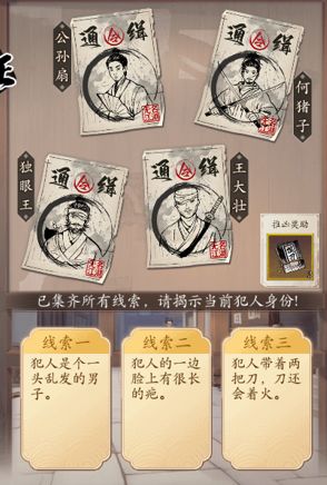 三、完成组合证词,最终将获得3条有效线索。少侠需根据线索,指认出告示牌中对应的通缉要犯;