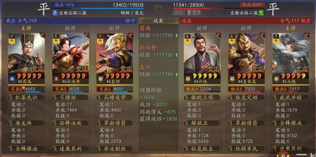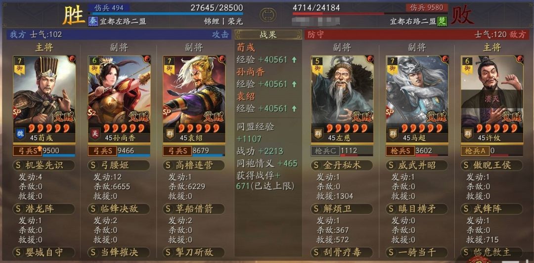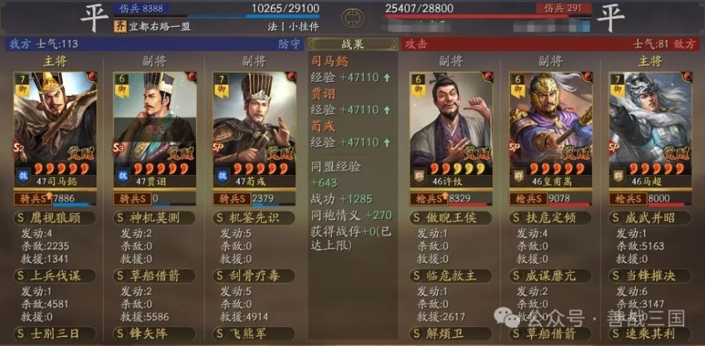 但打SP马超时配速略复杂却很重要,要控制队内SP袁绍1、孙尚香2、SP荀彧3,并尽量贴近,目的是让万军先降SP马超速,后让孙尚香和SP荀彧立马行动过去,避开对方辅助给SP马超解万军的控,此外考虑到皇马配有许攸,破绽打掉时会微量降速,可能会让我方产生乱速,还需要全队稍多差10点左右速度以应对,这部分只能自己战斗中把握;