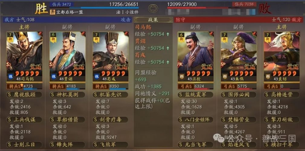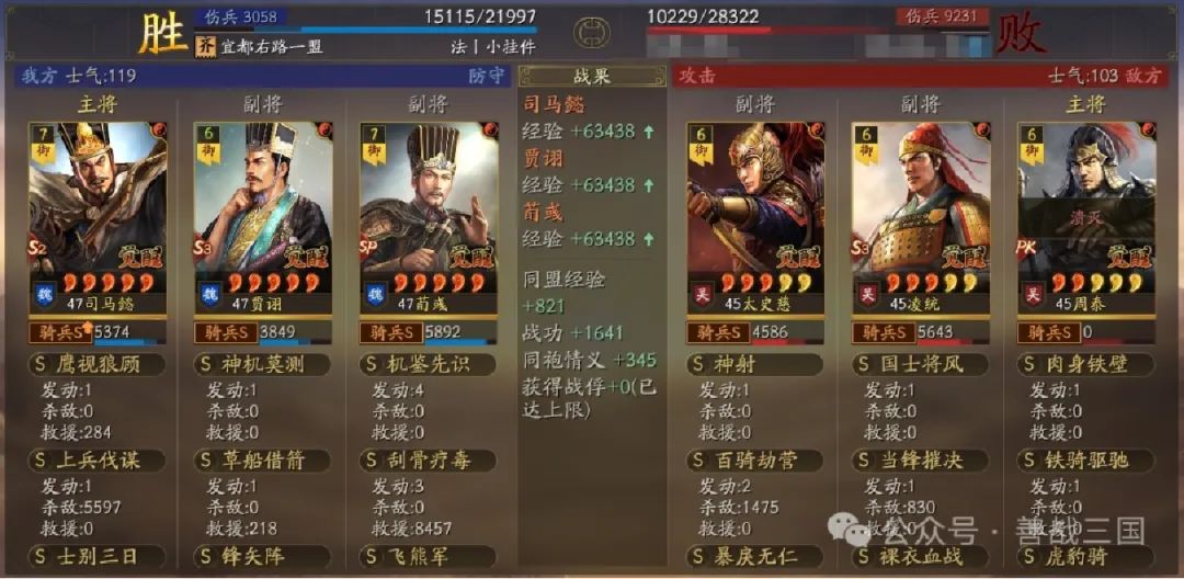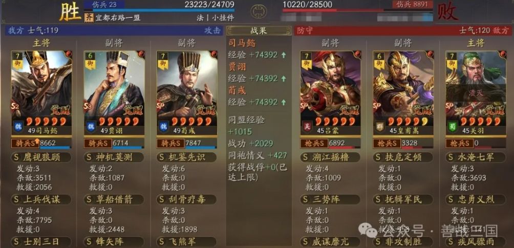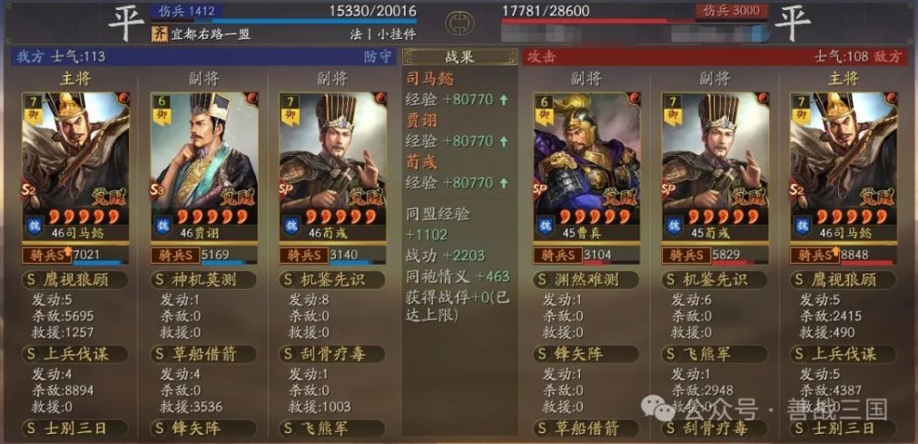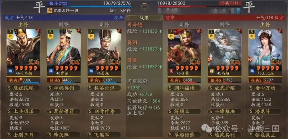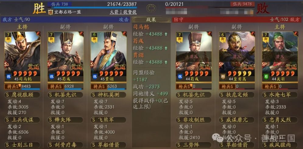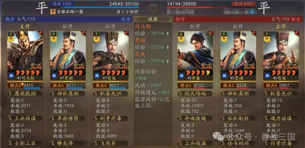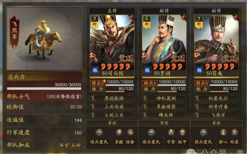 装备:刚需的司马懿宝物带骑散记,贾诩宝物格子带三略,还有贾诩尽量给个援助甲,因为这个队伍比较怕突击骑,送贾诩出去挡一下防着伪报打到SP荀彧,贾诩加统了也比较抗突击的揍。