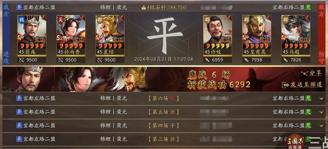 防御:sp荀彧主辅用警戒承伤同时大概率提供孙尚香的弓腰姬一层buff,sp袁绍承担半c半辅的作用,辅助战法选择方面,测试期间尝试了多种,不过整体大致差不多,主要就是续航、解控和控场这些防御类战法调和,还有些是专门针对SP马超的,其实打皇马枪时,SP袁绍的缴械,万军的降速、缴械,以及当锋的伪报,都有不同程度的克制,其中万军最为克制,但打其他队伍时不如带续航或是威谋这些防御;