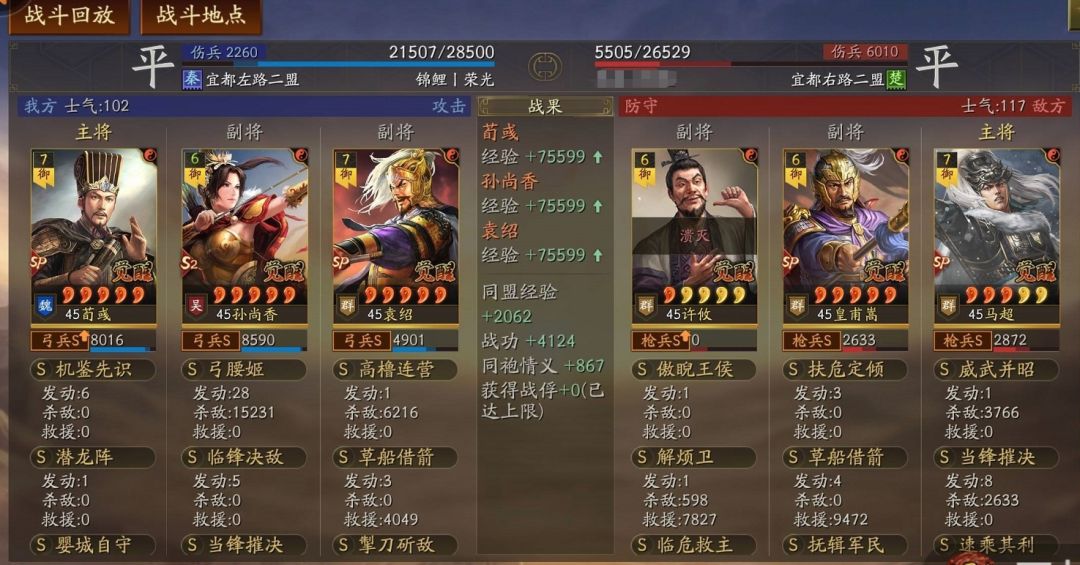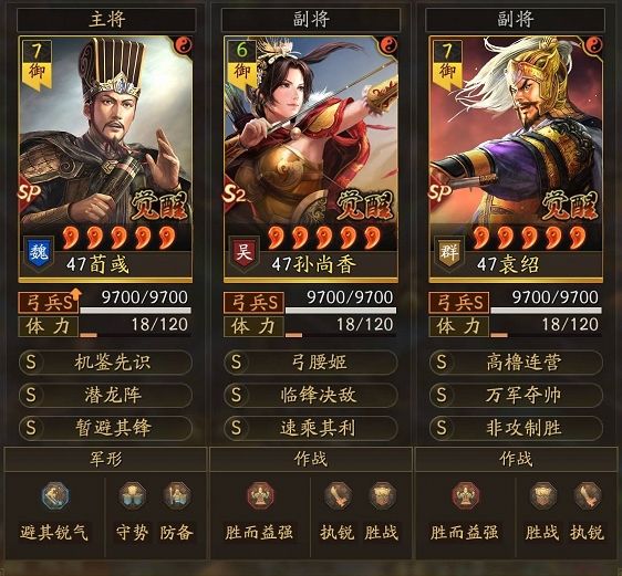 伤害:主c孙尚香的战法选择,临锋的连击+免疫缴械是刚需,既能提高弓腰姬触发次数,也能提高弓腰姬的加成效果,双收益;第二战法尝试过各种突击,带过速成、暴戾也试过当锋,感觉发动率特别低,和SP马超带突击没法比,都不如倒戈+洞察两种状态的“鲁莽”好用,再加上SP荀彧的警戒,装备“躲闪”的几率抵御,射日弓的惊鸿提供的必中(这儿没带),7种功能状态能最大程度保证弓腰姬5层叠满