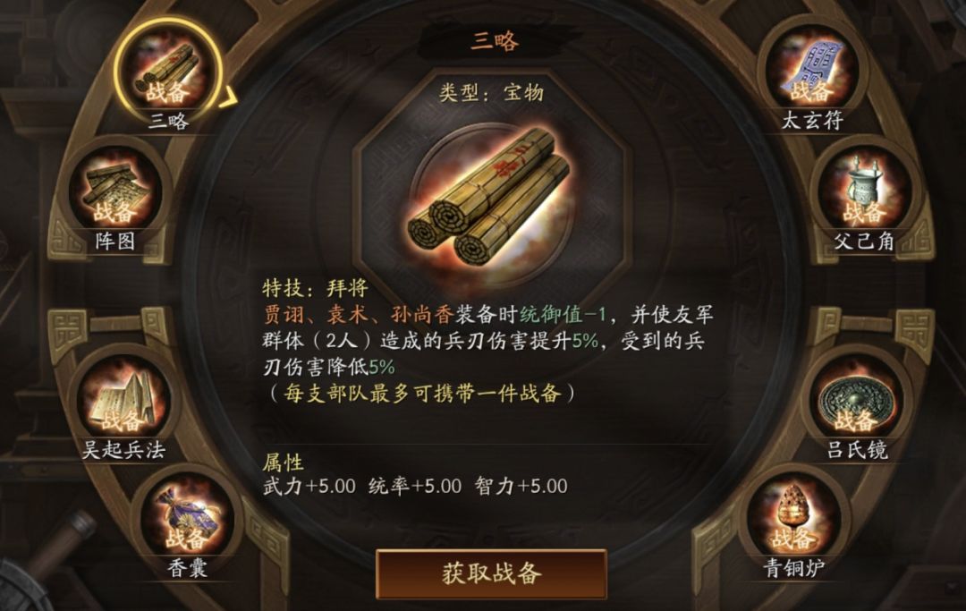 先前给主公们解读了8大战备的效果和优先级选择,不少主公对其中的战备“三略”的使用与搭配比较好奇,今天特邀攻略大神善战三国为大家指点迷津!