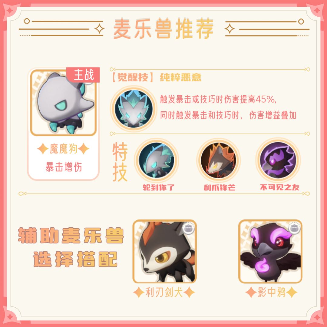 麦乐兽推荐“魔魔狗”触发暴击/技巧时增伤45%,攻击收益最高的麦乐兽之一。