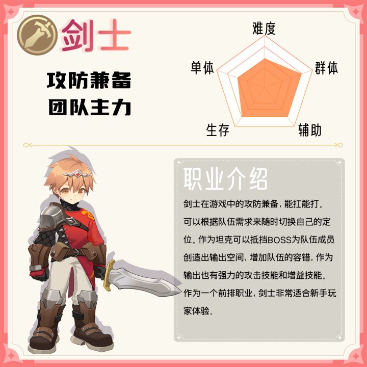 剑士在游戏中是一个攻防一体的战士职业,通过搭配不同的技能或者天赋可以改变战斗方式。作为坦克时,它可以抵挡BOSS,为队伍成员创造出输出空间,增加队伍的容错率;而作为输出也可以通过强力的攻击技能和增益技能打出较高的伤害。而剑士也是在队伍需求方面十分刚需的一个职业,上手难度也不高,非常适合新手玩家体验。