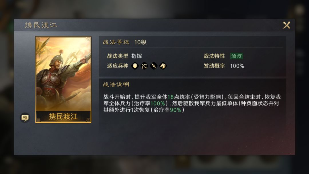 自带战法:【携民渡江】,指挥战法,可提升我军统率和恢复兵力,并且可以驱散一名友军的负面状态。