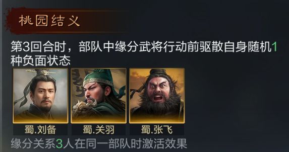 这个阵容能够激活缘分“桃园结义”,第三回合时能够驱散自身一种负面状态。刘备的高统率和高治疗,加上张飞的控制输出,和关羽的强力输出,让这个部队功能十分全面。