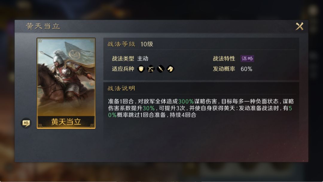 自带战法:【黄天当立】,主动准备战法,对敌方群体造成大范围群体谋略伤害。并有概率让自身跳过准备战法的准备阶段。