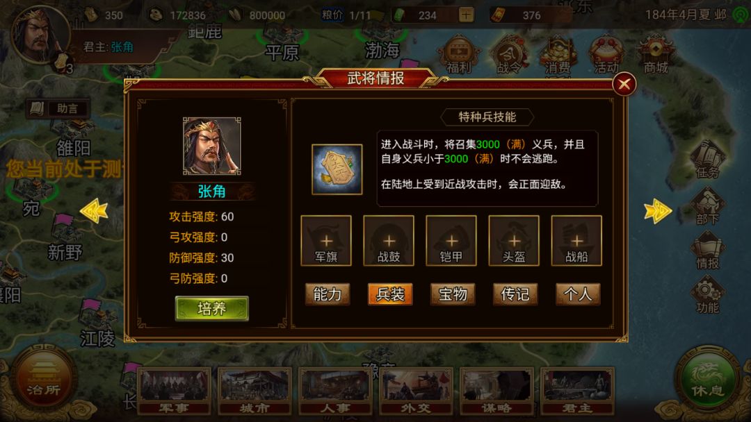 提升黄巾军的等级,可以为装配黄巾军兵符的部队带来 60攻击强度、30防御强度 加成。