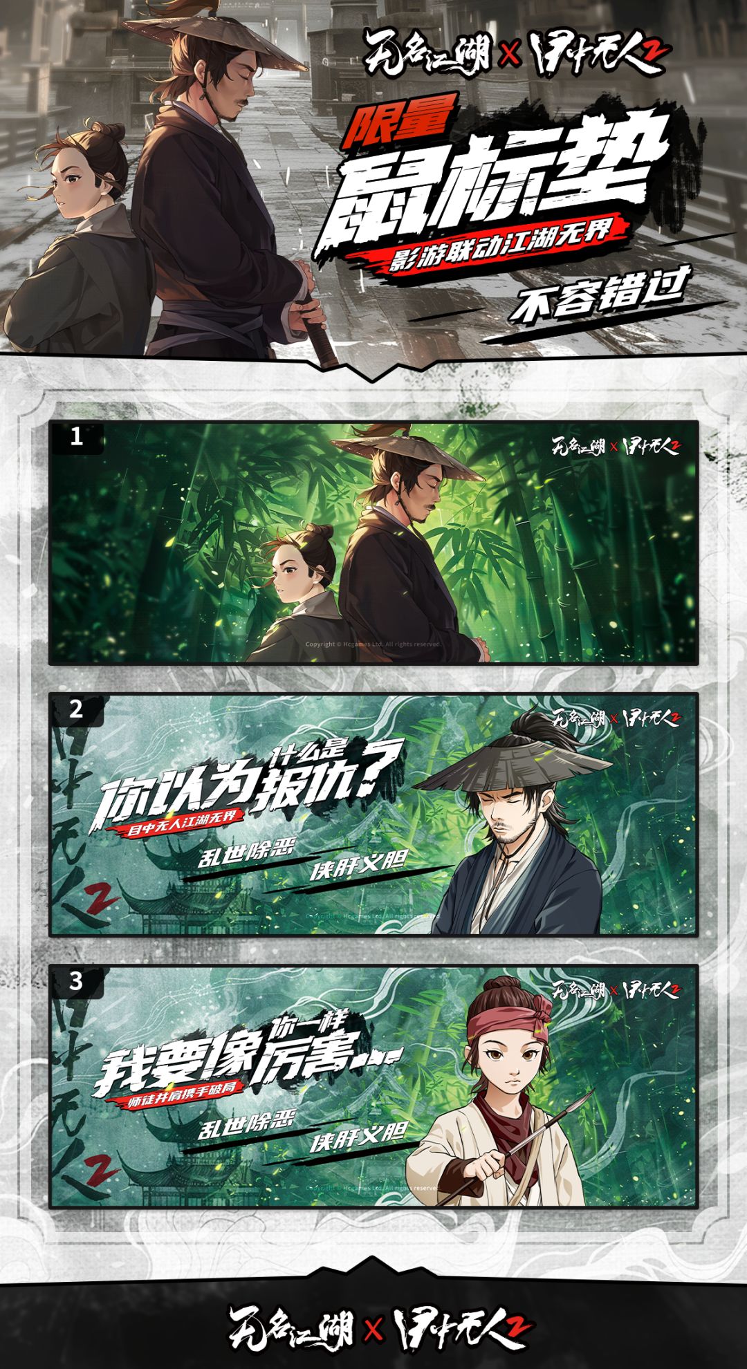 按照下方活动详情参与活动,将从成功参与活动的少侠中,抽取10位送出最新联动周边:无名江湖 x《目中无人2》限量鼠标垫。