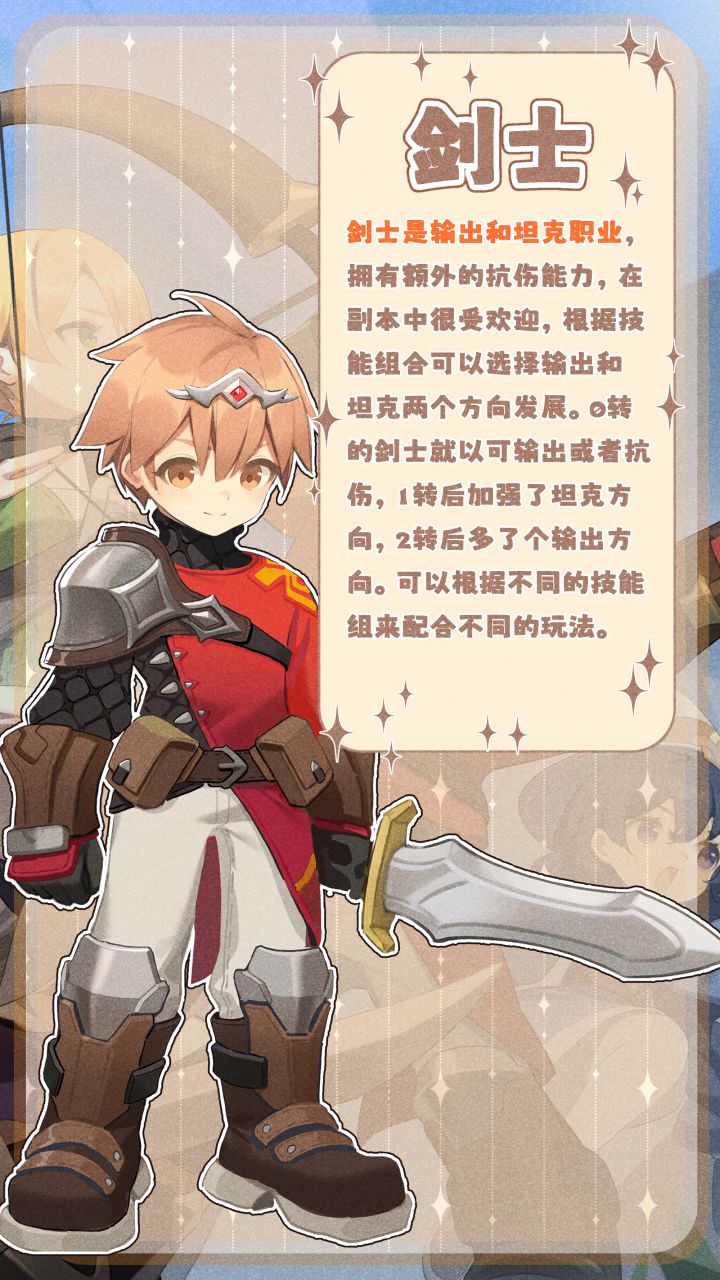 剑士是输出和坦克职业,拥有额外的抗伤能力,在副本中很受欢迎,根据技能组合可以选择输出和坦克两个方向发展。0转的剑士就以可输出或者抗伤,1转后加强了坦克方向,2转后多了个输出方向。可以根据不同的技能组来配合不同的玩法。