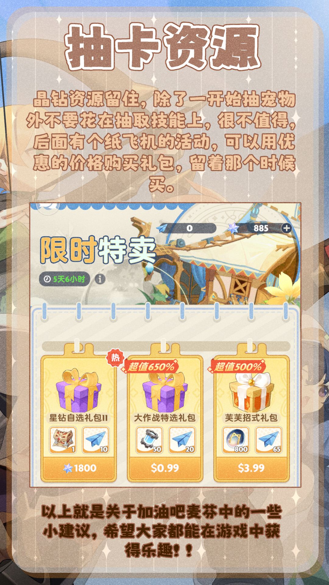 晶钻资源留住,除了一开始抽宠物外不要花在抽取技能上,很不值得,后面有个纸飞机的活动,可以用优惠的价格购买礼包,留着那个时候买。