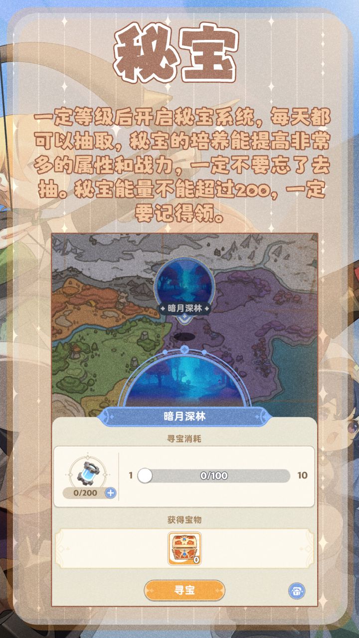 一定等级后开启秘宝系统,每天都可以抽取,秘宝的培养能提高非常多的属性和战力,一定不要忘了去抽。秘宝能量不能超过200,一定要记得领。