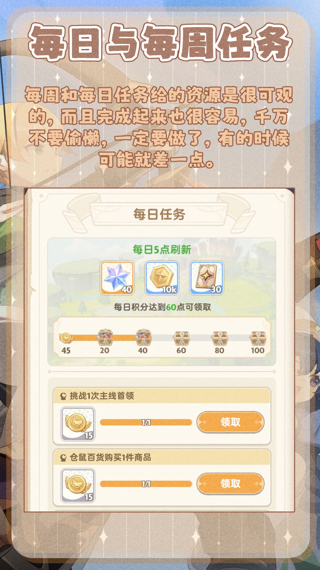 每周和每日任务给的资源是很可观的,而且完成起来也很容易,千万不要偷懒,一定要做了,有的时候可能就差一点。