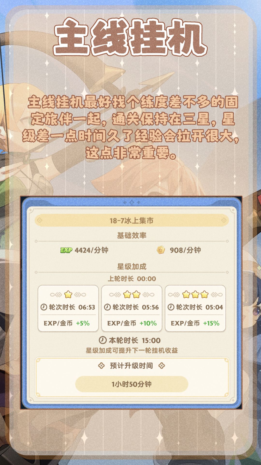 主线挂机最好找个练度差不多的固定旅伴一起,通关保持在三星,星级差一点时间久了经验会拉开很大,这点非常重要。