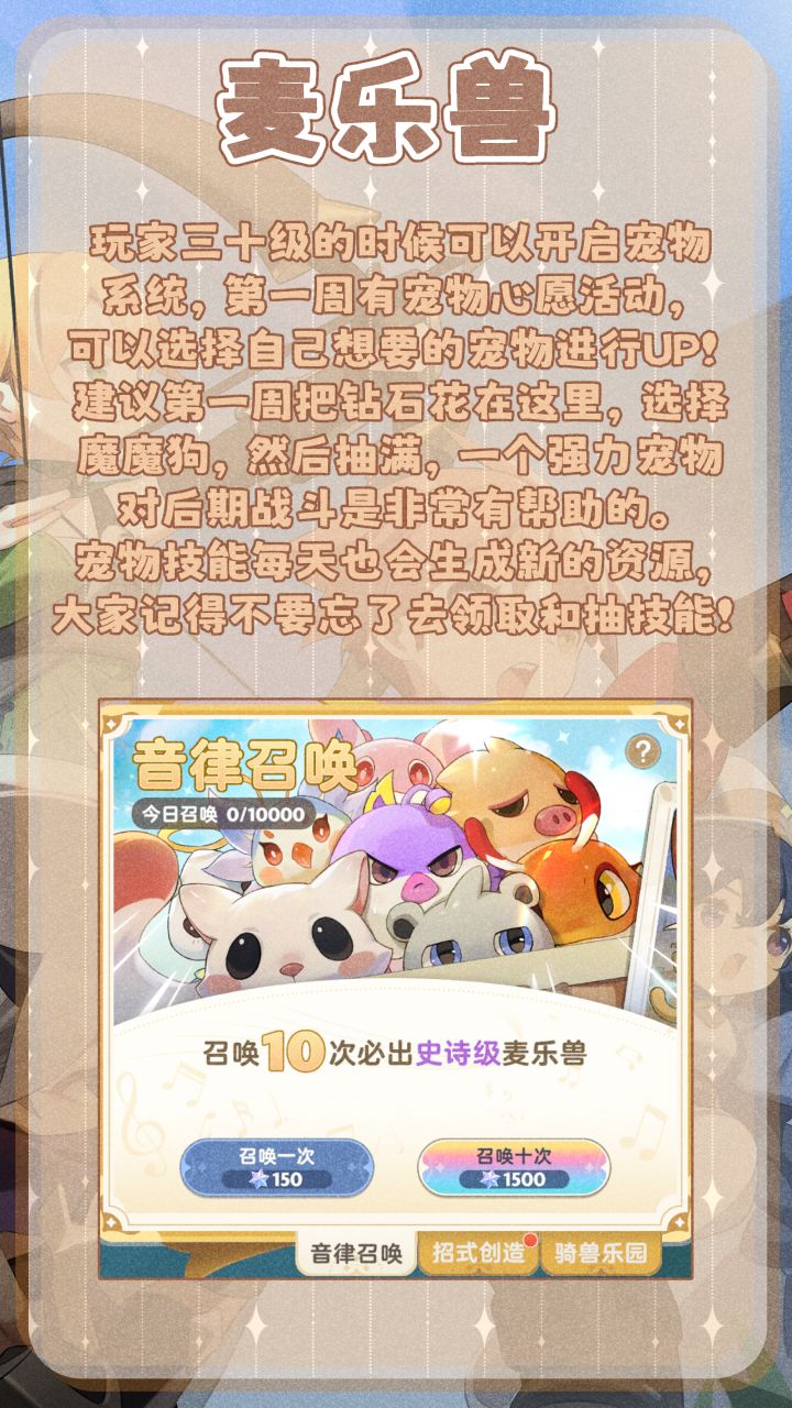 玩家三十级的时候可以开启宠物系统,第一周有宠物心愿活动,可以选择自己想要的宠物进行UP!建议第一周把钻石花在这里,选择魔魔狗,然后抽满,一个强力宠物对后期战斗是非常有帮助的。