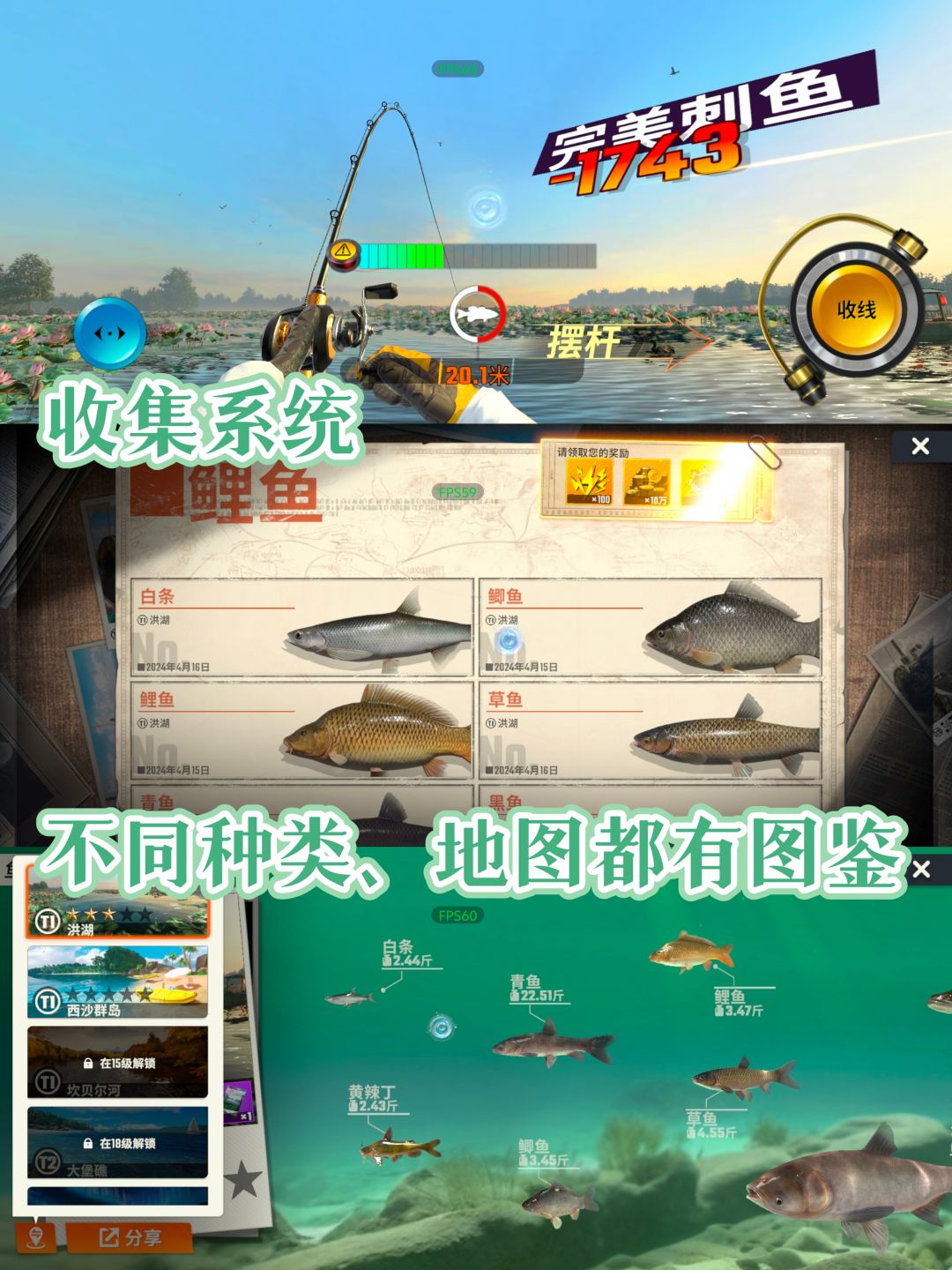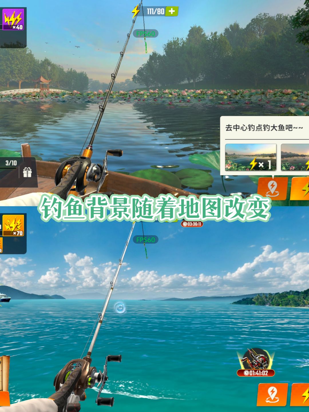 👉可以自由探索湖泊、大海等各类水域,随着等级的提升,你将陆续解锁不同的钓鱼点,每个地点的鱼群种类也是不同的。