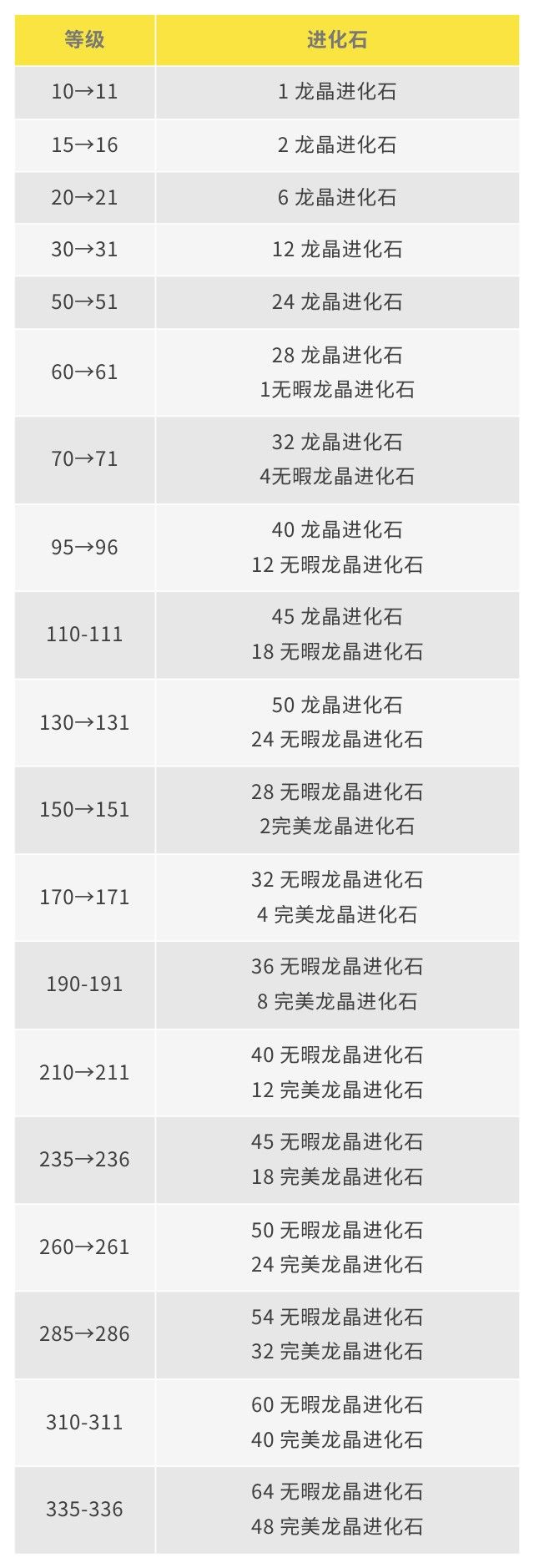 无暇龙晶进化石和完美龙晶进化石可用于达到一定等级后的进化突破,除此之外无其他作用,大家需要按需兑换,各等级需求量如下