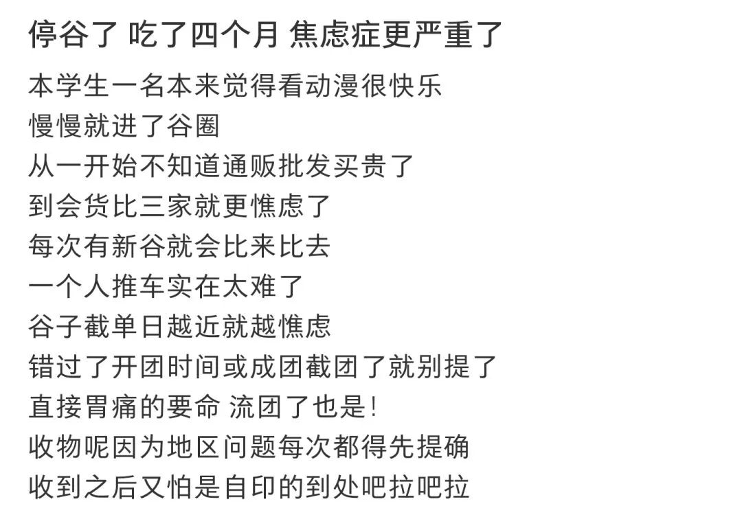 到最后,变成收藏品的谷子,又进而衍生了两类有些极端的消费者:一种是整天推车、蹲团、比价,操心是亏了还是赚了;一种是买谷买到停不下来又无法戒断,而后者的数量(各种xx停谷版)在网络上肉眼可见不在少数。