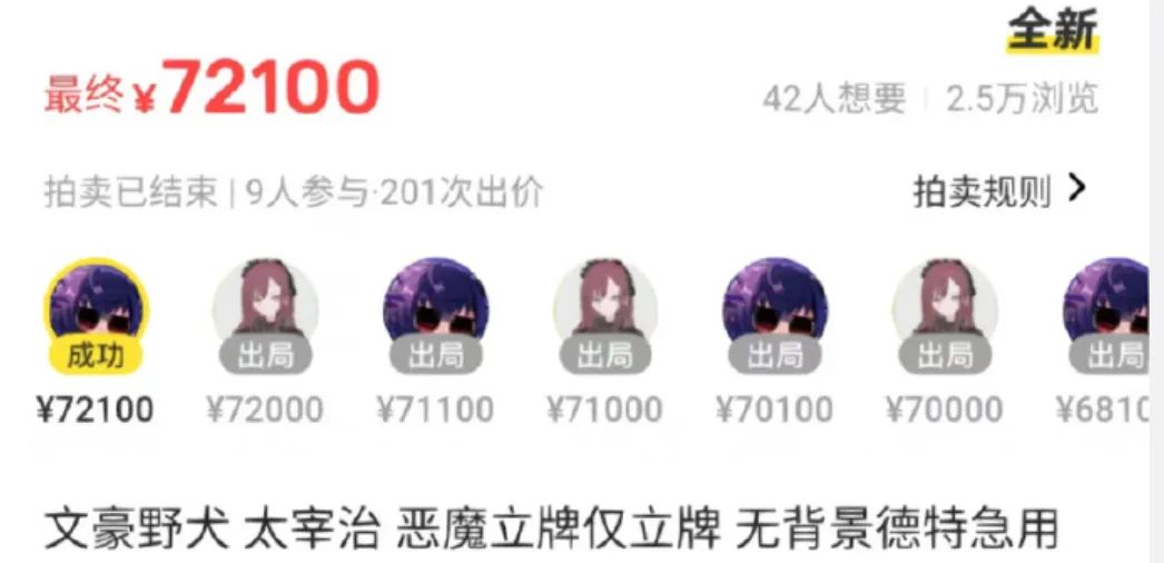 以及太宰治恶魔立牌大盘(有其他稀有谷捆物)拍卖大战,以7w2的成交价流为传说,等等。