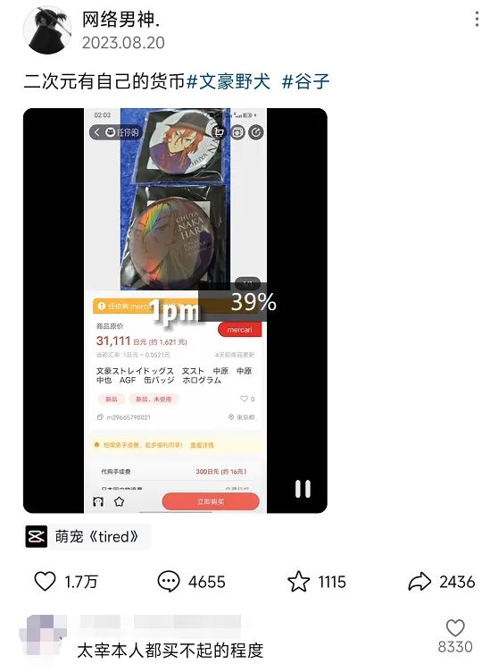 比如知名烫门五条悟、太宰治、及川彻、朔间零等,不仅IP占据了谷店的半壁江山,其中热门谷的交易价格甚至能直接飙到数万元,给所有人一点小小的吃谷震撼。物品本身实际上没有过高的工艺价值,大家更多是在为爱买单,其中比较知名的案例包括但不限于: